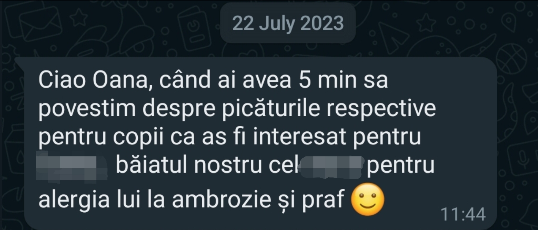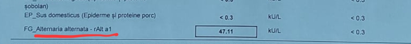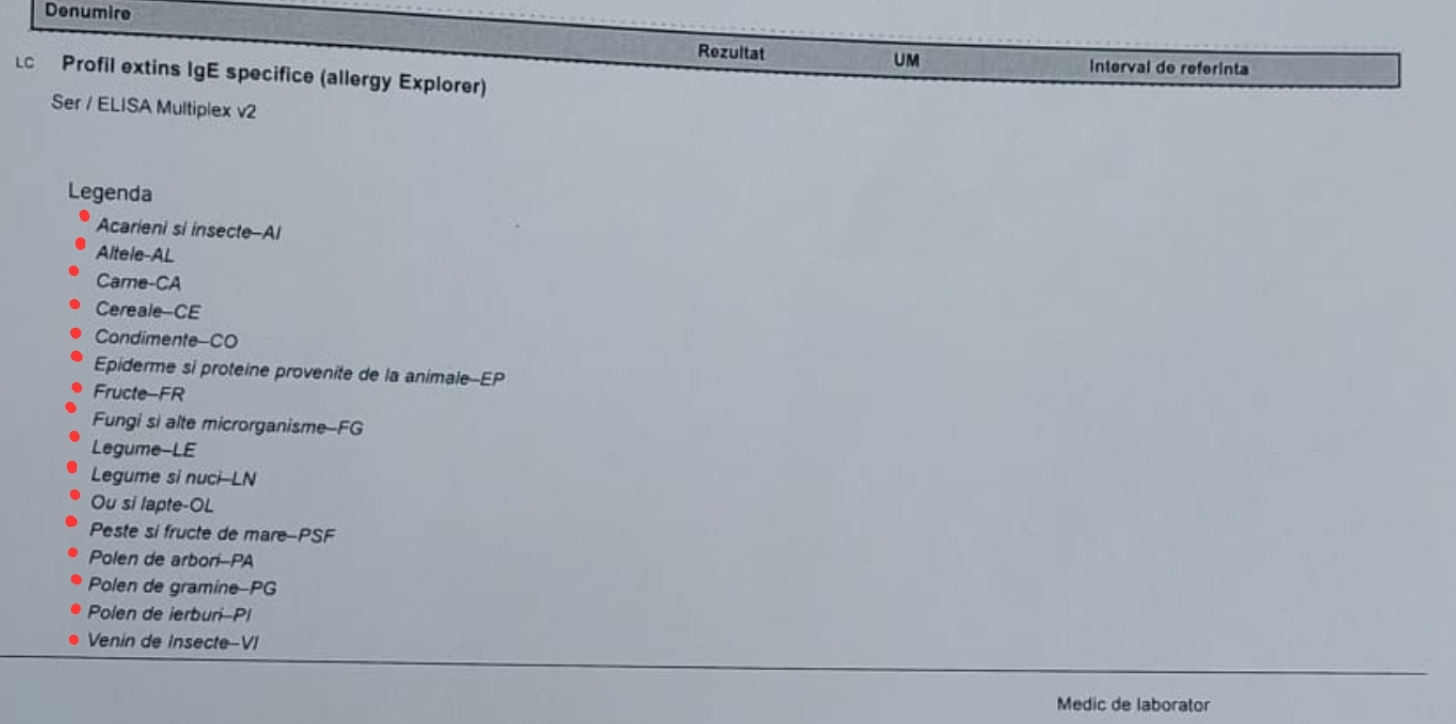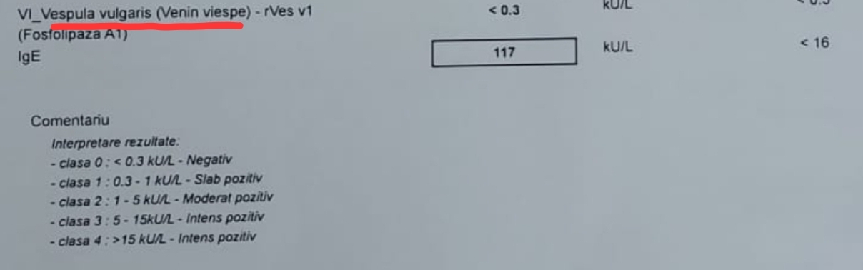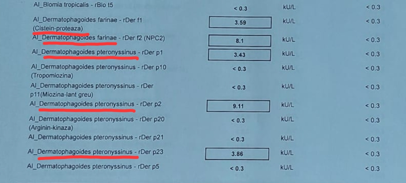 Studiu de caz: copil, prezintă reacții alergice la acarieni, insecte, carne, epiderma de animal și proteine provenite de la animale, cereale, fungi, legume, nuci, polen de arbori, ierburi și venin de insecte.