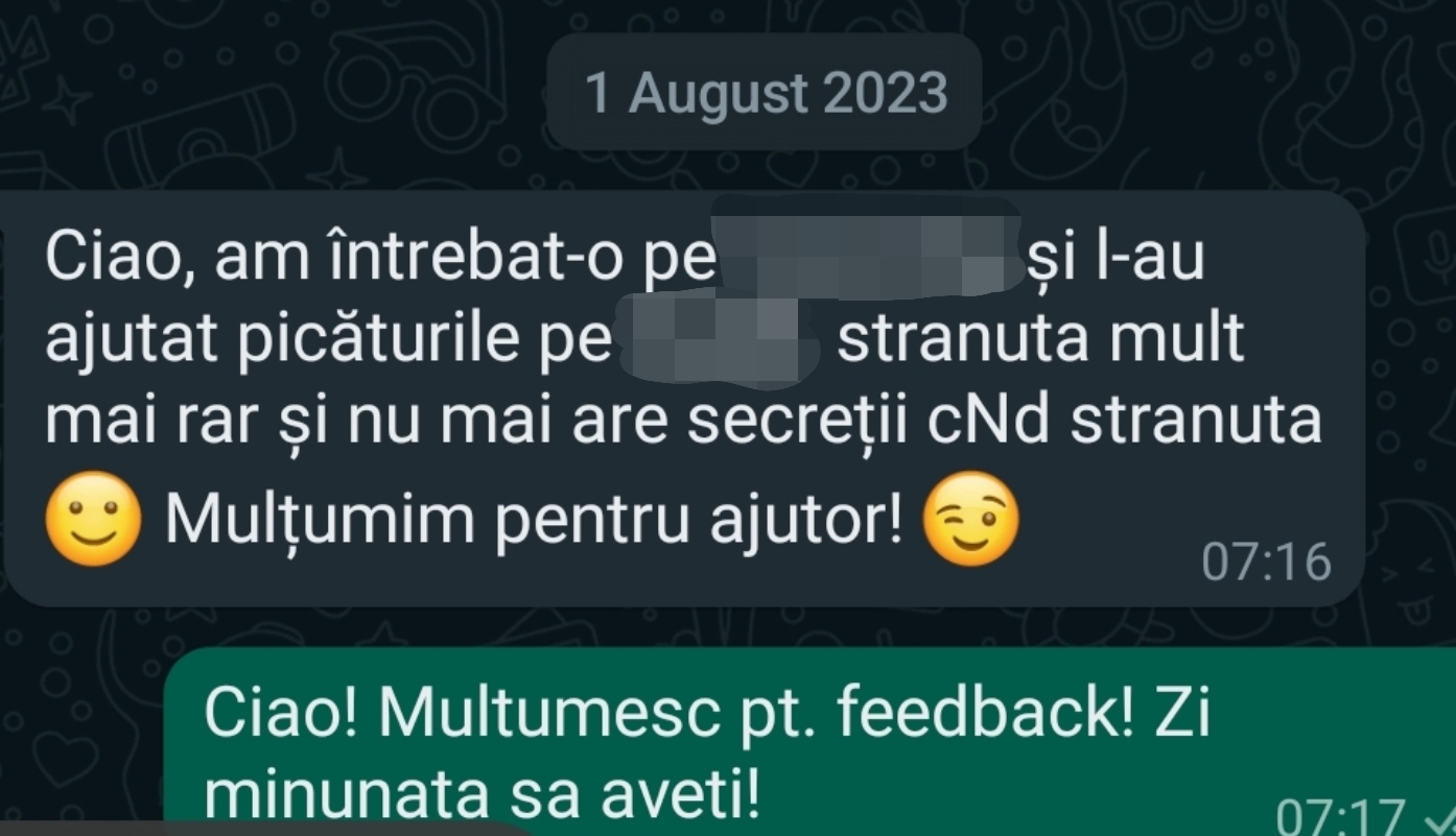 După terapie: simptomele s-au ameliorat, strănutul și secrețiile nazale au dispărut, starea generală fiind îmbunătățită.